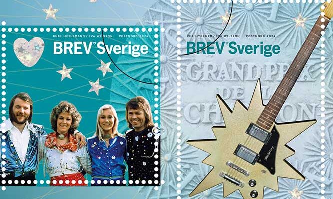– Hela jubileumsarket är som ett hologram fullt av spännande detaljer som speglar ABBA:s scenkläder från vinsten i Brighton. I motiven har jag gjort två små skivomslag med ABBA, då och nu. Ett porträtt är från vinsten för 50 år sen och det andra visar gruppen utanför ABBA Arena i London. En rolig detalj är att ABBA-medlemmarna är placerade i spegelvänd ordning på frimärkena. Och Björns ikoniska stjärngitarr är såklart med, säger Eva Wilsson.