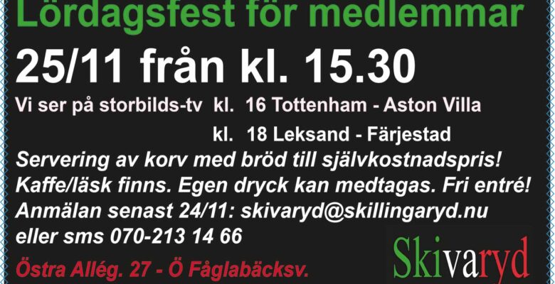 Välkommen till medlemsfest med Skivaryd nu lördag 25/11 kl. 15.30. Vi fikar, kan se matchen Tottenham – Aston Villa med start 16 och Leksand – Färjestad klockan 18.