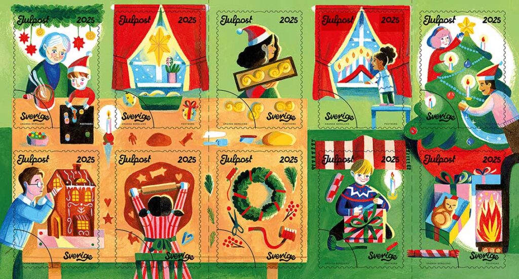 I dag den 6 november 2025 släppte Postnord årets julfrimärken med temat ”Julstök” – en hyllning till de traditioner, dofter och stunder som gör julen speciell. Årets frimärken är illustrerade av Amanda Berglund.
