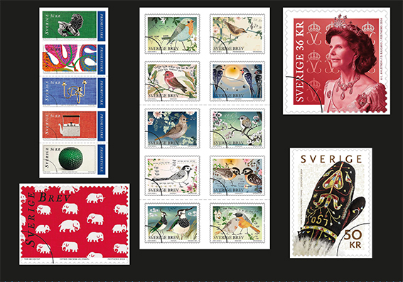 - Drottning Silvia: Rulle 100 frimärken, 1 motiv, utrikes porto, foto: Anna-Lena Ahlström, grafisk form Daniel Bjugård.