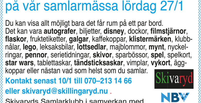 Lördagen den 27 januari 2024 klockan 10.00-16.00 har vi en samlarmässa i våra lokaler. Våra medlemmar visar upp lite av det vi samlar på och begränsad försäljning sker också.