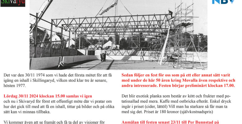 Lördag 30/11 2024 klockan 15.00 samlas vi igen och nu i Skivaryd för först ett offentligt möte där vi pratar om hur det gick till med att få en ishall, titta på bilder och på olika sätt minnas tillbaka. Vi kommer även att se framåt och få ta del av visioner för Movalla.